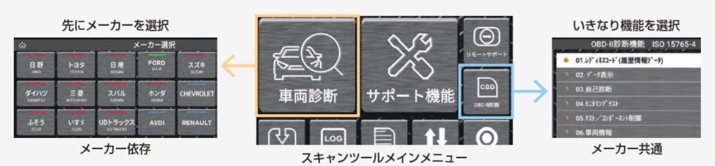 排ガスOBDは、多くのスキャンツールで車両診断とは別メニューとして設けられ、メインメニューから直接、機能選択へ進む構成になっています。これは、排ガスOBDの仕様が各カーメーカー間で共通化されており、メーカー選択が不要なためです。