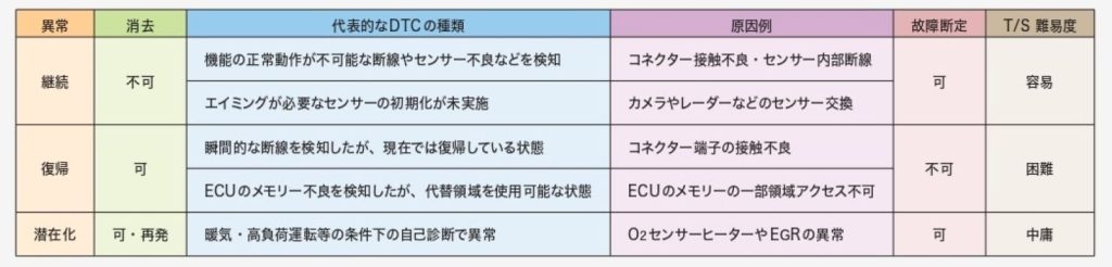 「現在も異常が継続している場合は、スキャンツールでDTCを消去しても自己診断がすぐに行われるため、実質的に消去できません。一方、自己診断の実行に条件がある場合は、一時的に消去が可能なケースもあるため、状況に応じた見極めが重要です」という結論になります。