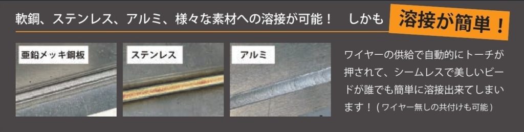 軟鋼、ステンレス、アルミニウムなど多様な素材への溶接が可能。ワイヤーの供給により自動的にトーチが押され、シームレスで美しいビードを誰でも簡単に形成できる。ワイヤーを使用しない共付けも可能。