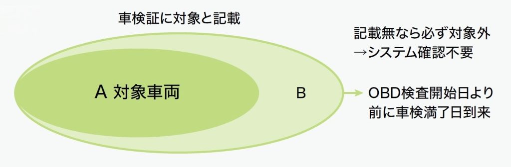 車検証の記載と実際の初回車検のOBD検査の適用の関係は図1のようになります。AのOBD検査の対象車は車検証記載の楕円の中に含まれますので、記載なしの場合は確実に対象外と言えます。図のAの外側のBの薄い網掛けの部分は車検証の記載があるにもかかわらず対象外であることを表し、OBD検査開始日より前に車検満了日が到来した場合が該当します。