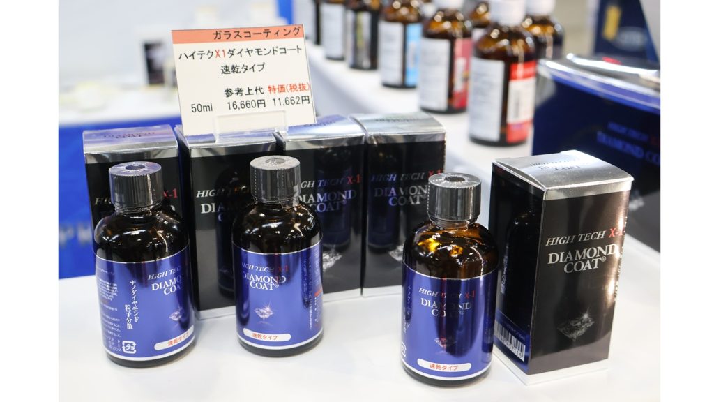 超撥水ガラスコーティング剤「HIGH TECH X-1 DIAMONDCOAT」を展示。施工の2時間後から撥水が始まる超速乾性で、粘度も低いため作業性の向上にも期待できる