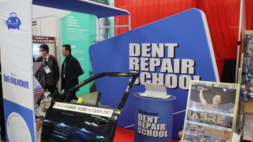 デントリペアツールの展示及び販売だけでなく日本デントショップネットワーク本部が運営するデントリペアスクールを紹介。ドアパネルなどへの実演も行われた