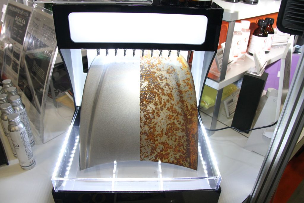 オリジナルコーティングブランド「CQ クオリティクオーツ」シリーズの効果をミニパネルで実演。先着30人にはハイエンドモデル「HYBRID F+S」のサンプルが配られ、2月14日まで同様に配布予定だ。防錆コーティング剤の「NWX‐25」は未施工部分のパネルと比較展示。有機ポリシザラン樹脂に添加剤を加え、硬化膜を厚くすることで防食機能を高めてあり、その一目瞭然の効果に来場者は目を見張った