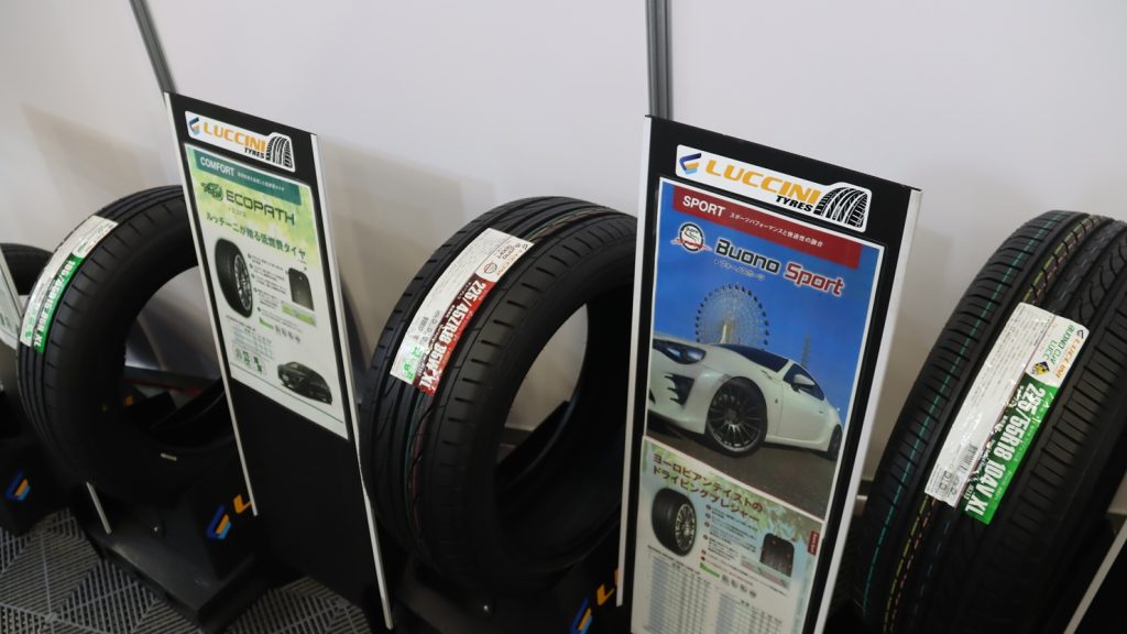 輸入総代理店となるタイヤブランド「ルッチーニタイヤ」シリーズを展示。スポーツタイプの”Buono Sport(ヴォーノスポーツ)”や低燃費タイプの”ECOPATH(エコパス)”のラインアップを訴求した