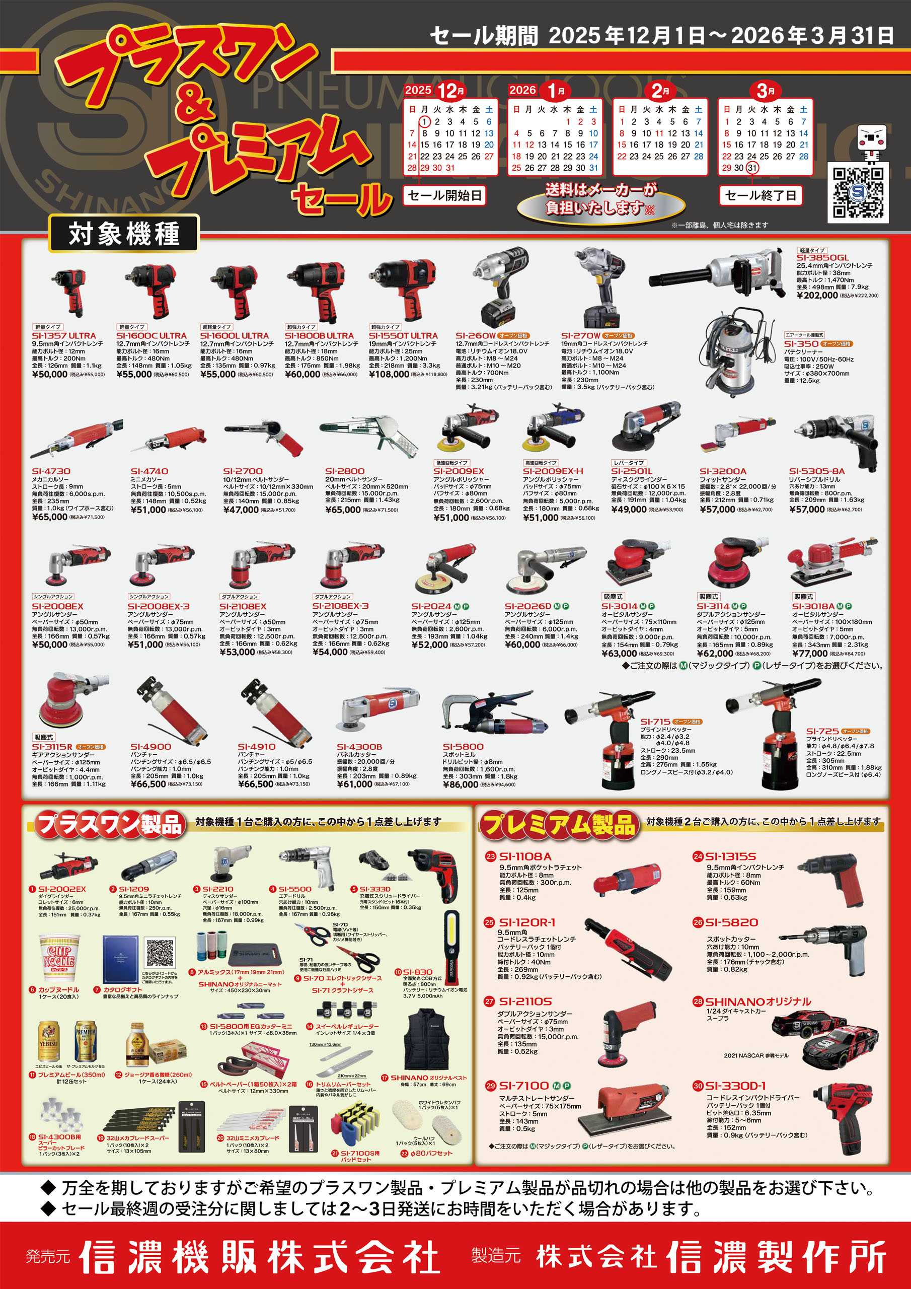 対象機種を1点購入した場合はプラスワン製品を、2点購入ならプレミアム製品をプレゼントする。対象機種は、インパクトレンチ(SI-1357 ULTRA等)やアングルポリッシャー(SI-2009EX/EX-H)やサンダー(SI-3014/3114/3018A等)など34点。