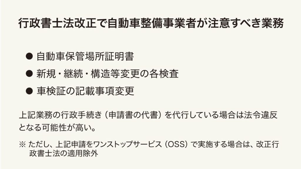 改正のポイントはいくつか挙げられるが、中でも整備事業者が理解しておかなければならないのは、業務制限規定の明確化である。改正法第19条第1項には、「他人の依頼を受けいかなる名目によるかを問わず報酬を得て」という文言が追加された。