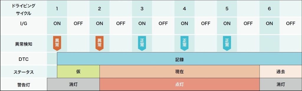 たとえば、エンジン始動から走行、停止までの一連の動作を「1ドライビングサイクル(DC)」と呼びますが、「現在」状態になったDTCが、2回連続で異常なしと判定されたDCを経ることで、初めて「過去」状態へ移行します。