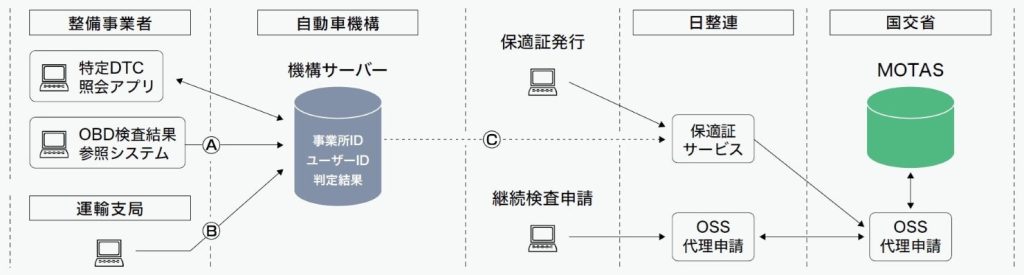 この状況を受け、整備振興会などの業界団体からは、継続検査時にOBD検査の適合判定履歴をチェックする機能の追加が要望されました。そのためには継続検査の前工程である保適証サービスに確認機能を追加すれば早い段階でのチェックが実現できます。