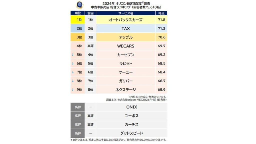 • 調査名:2026年 オリコン顧客満足度調査 中古車販売店