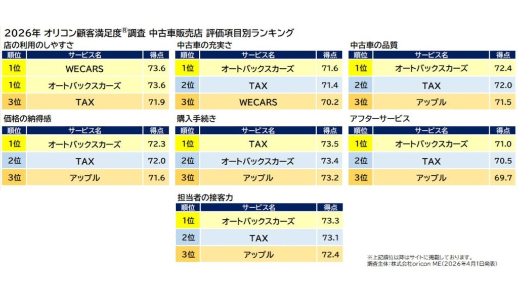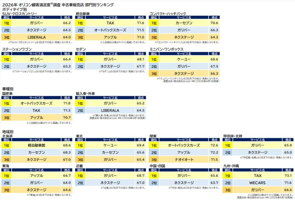 オリコンは4月1日、グループ会社のoricon MEが実施した「中古車販売店」顧客満足度調査の結果を発表した。