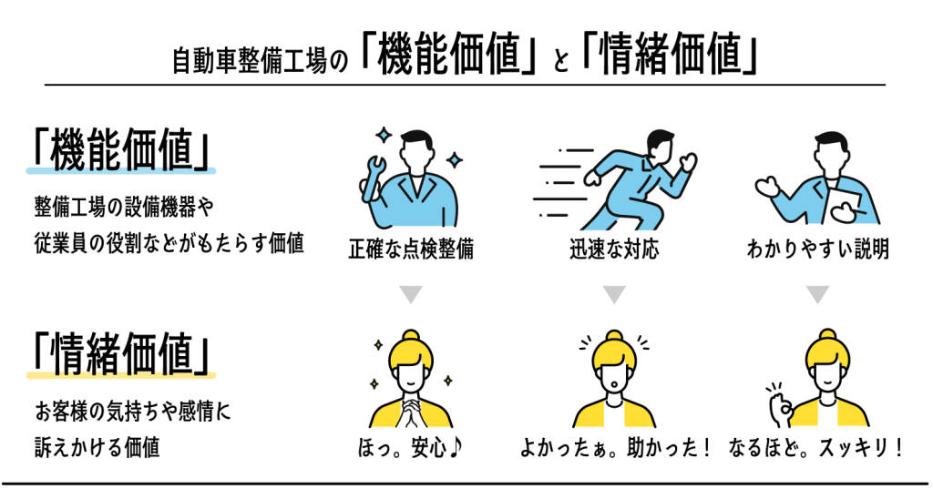 顧客への提供価値は「機能価値」と「情緒価値」に分類できます。「機能価値」は整備工場が持つ技術や設備がもたらす価値のことです。たとえば「早い」、「正確」、「安い」などが該当します。