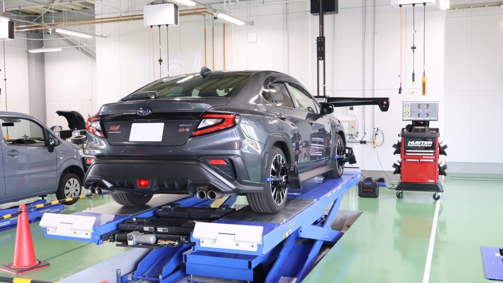 同社3拠点目となる同店は、メンテナンス部門の強化を図るべく、車検・整備に特化した店舗。敷地面積660坪に建てられた新工場には、整備スペース4ベイ、完成検査ライン1ベイを設け、パンタグラフ式リフト2基、ドライブオンリフト1基、4輪アライメントテスター、エイミングツールほか最新設備を備える。