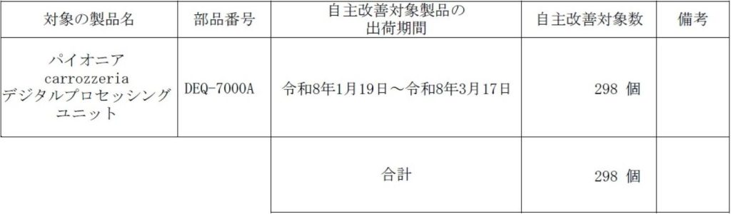パイオニアは後付け用品として販売したcarrozzeria デジタルプロセッシングユニット「DEQ-7000A」について自主改善を実施することを発表した。