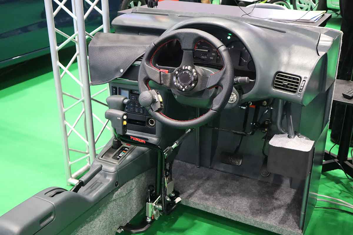 ハンディキャップドライバー向けの自操補助装置を開発する同社は今年50周年。ハンドルやアクセルペダルに架装することで安全な運転操作を支える各種装置を体験展示した