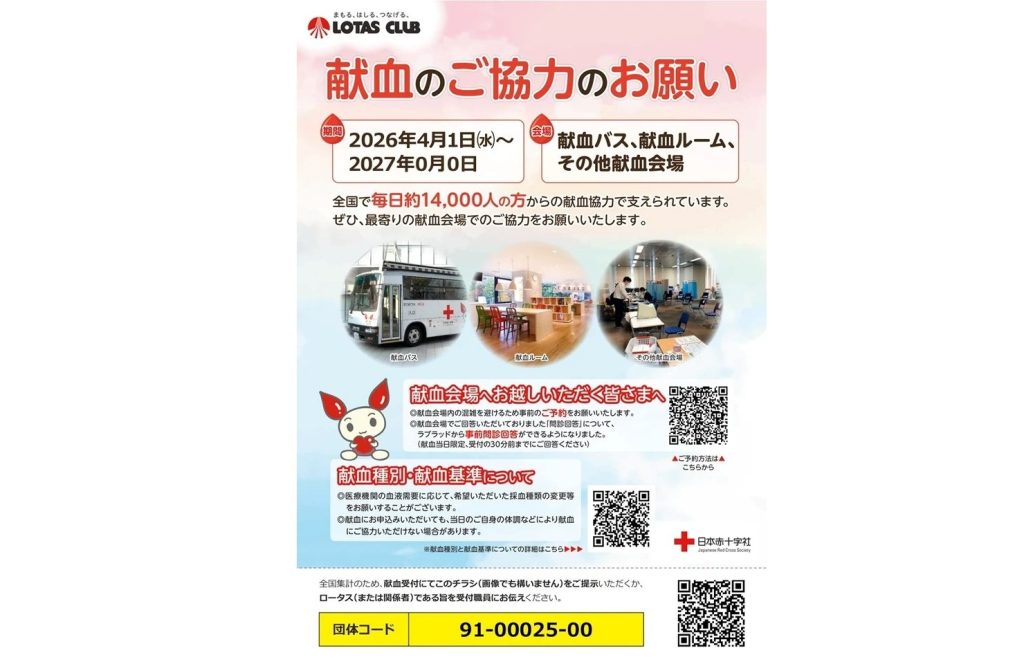 ローダス店で配布されたチラシを持参する、または受け付け時に「ロータス」と伝えて、近くの献血ルーム等にて献血に協力するよう呼び掛けている。
