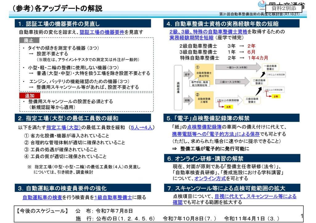 2025年7月に施行された事業規制アップデート(図1)は、認証工場の機器要件の見直し、指定工場(大型)の最低工員数の緩和、自動運転車の検査員要件の強化、自動車整備士資格の実務経験年数の短縮など、7つの項目からなる。