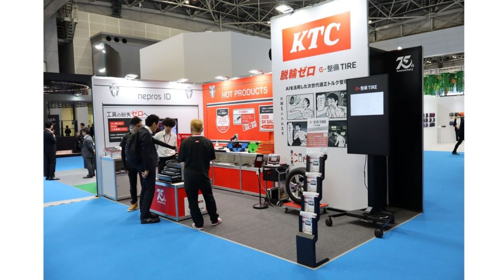 このほか、生産ラインなどで使用する共有工具の持ち出しや返却を管理し、紛失を防ぐRFIDタグ内蔵のデジタル工具「ネプロスID」を出品。また、来年4月20日まで開催する「2026SKセール」の告知や、創業75周年を記念して限定75セットのみ販売する「75周年記念限定工具セット」、好評を博している電動工具「9.5sq.コードレスラチェットレンチセット」も展示した。