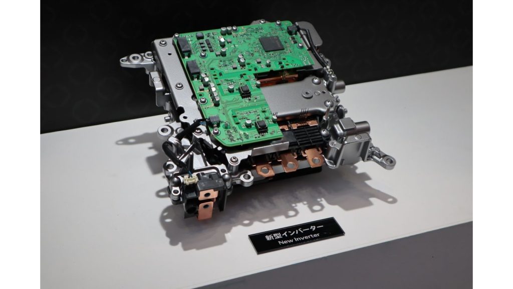 インバーターは、バッテリーからの直流電流を交流電流に変換する。今回展示したこのインバーターは、電流変換を行うパワーカードにSiC(シリコンカーバイド)パワー半導体を採用。従来は、コアモジュールにパワーカードを縦に並べて配置していたが、それらを平置き、かつ両面冷却する構造へと進化させることでコアモジュールを30%小型化。さらに、電力損失も70%低減し、小型化と高効率化を両立したことで世界最高の出力密度を実現。車両全体の電力効率の向上に貢献できる。